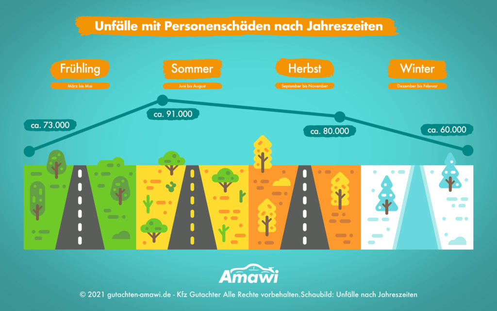 Die wenigsten Unfälle mit Personenschäden gibt es erstaunlicherweise im Winter. Dies liegt wahrscheinlich daran, dass vorsichtiger und vielleicht auch langsamer gefahren wird, weil man sich der Gefahr bewusst ist. Unfälle kommen zwar vor – gerade im Zusammenhang mit Schnee und Glatteis – oft bleibt es aber bei Sachschäden.