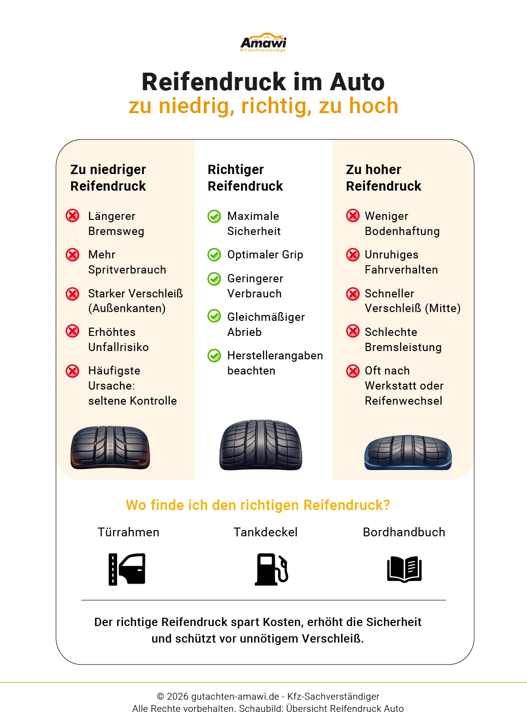 - Vernachlässigter Reifendruck kann bei Unfällen zu Mitverschulden und Versicherungsproblemen führen.