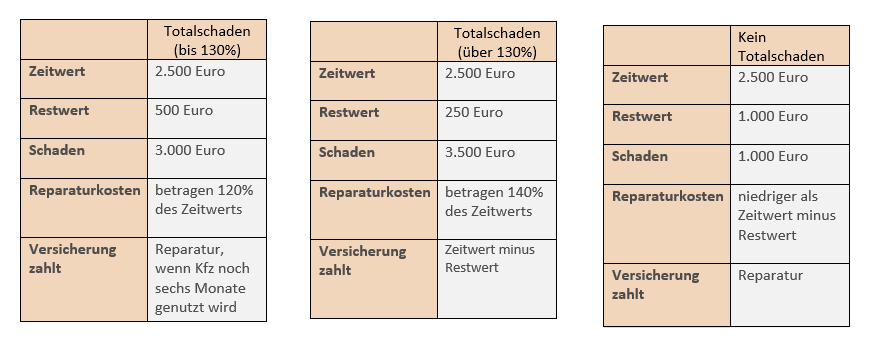 Falls die Reparaturkosten zwischen 100% und 130% des Wiederbeschaffungswertes betragen, ist es nur möglich, die Reparatur fachgerecht ausführen zu lassen, sie können sich die erhöhten Reparaturkosten nicht auszahlen lassen. Es sind weitere Regelungen zu beachten